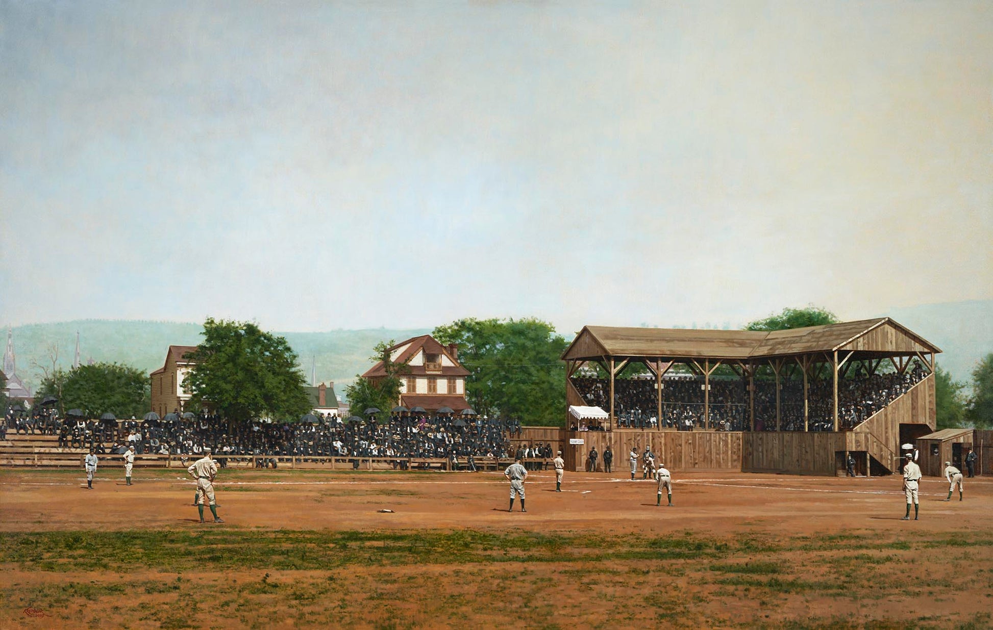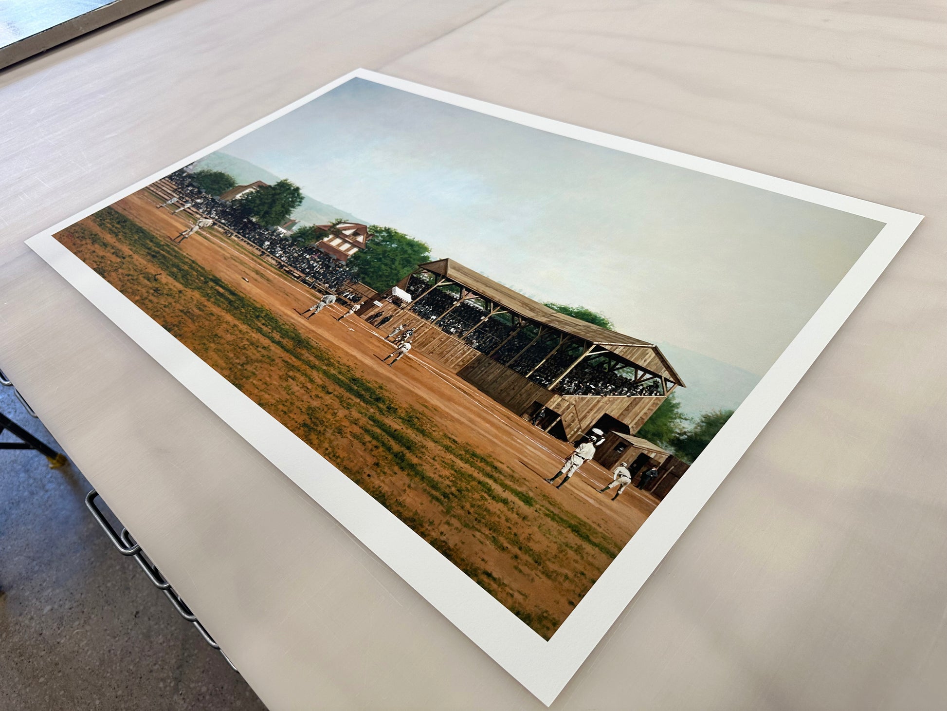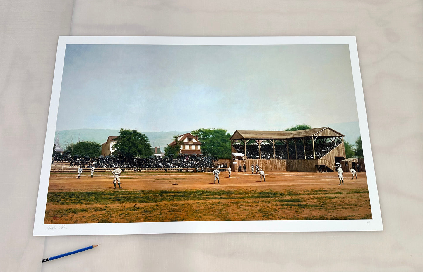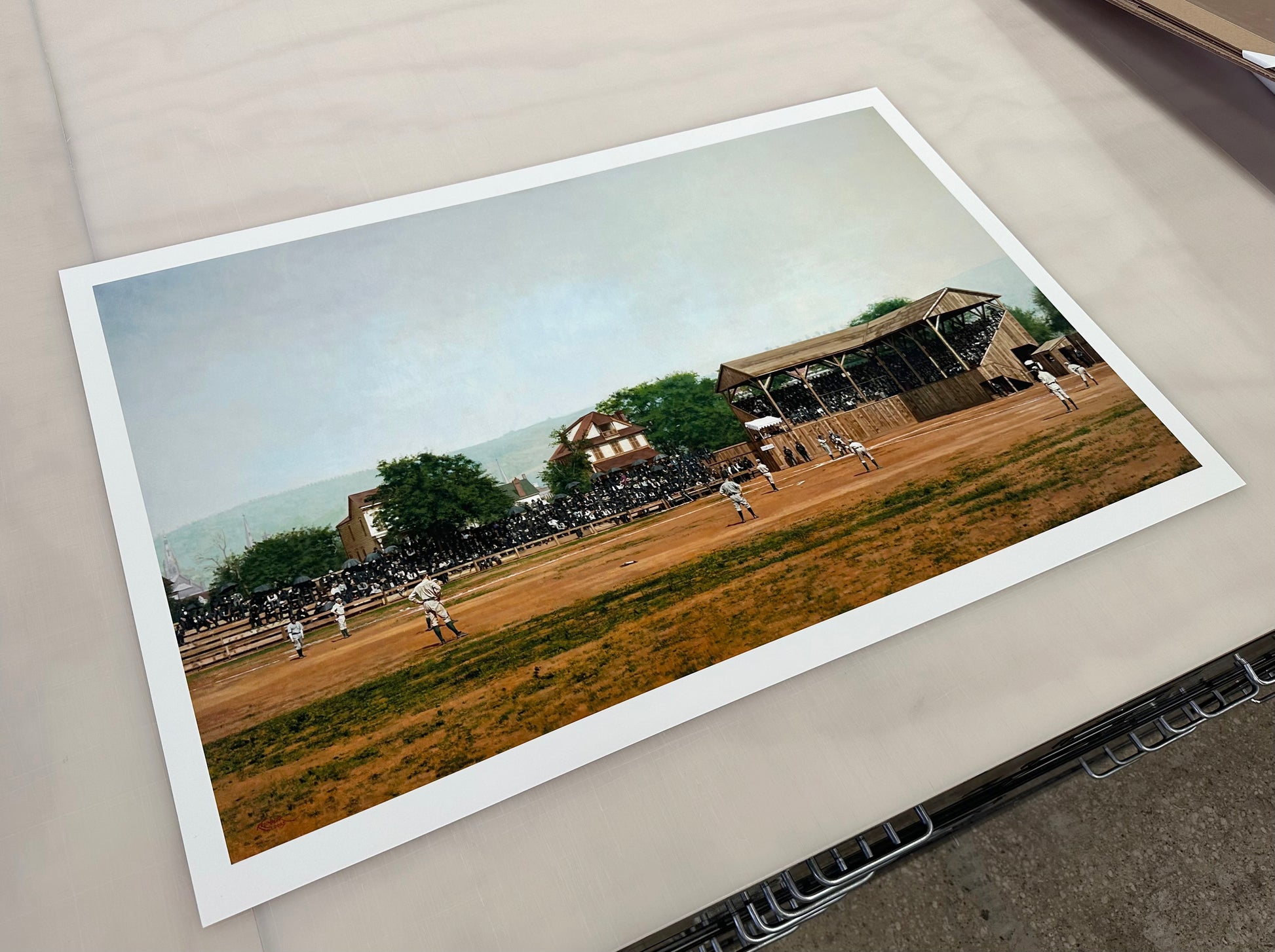 The original painting is based on a photograph by W.C. Brown depicting a game between the Wheeling Green Stockings and Kalamazoo Kazoos on May 19, 1887. We're seeing action at the end of the seventh inning at Island Park in WV, with the away team at bat. The photographic reference is courtesy of the Ohio County Public Library, Wheeling, WV.