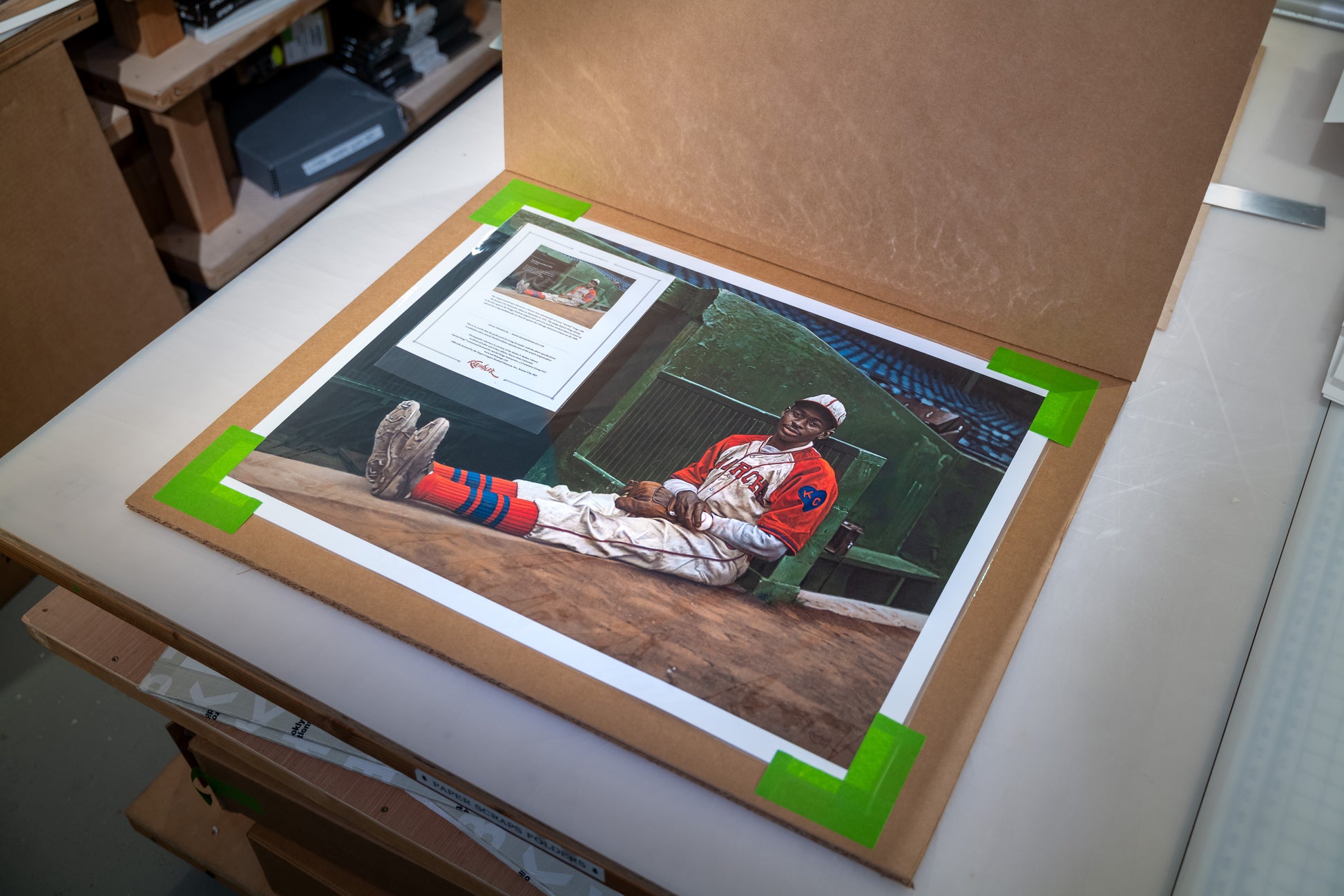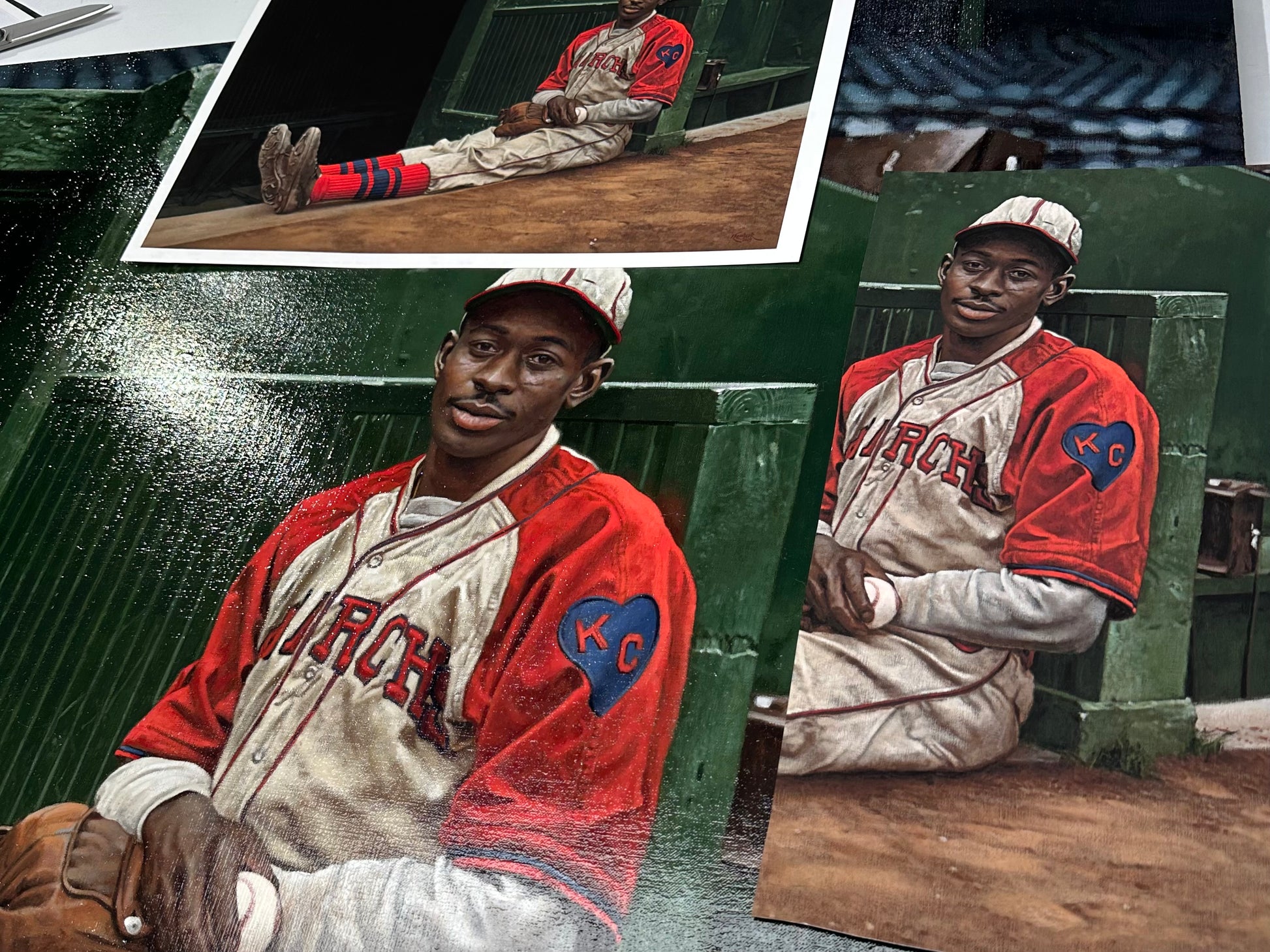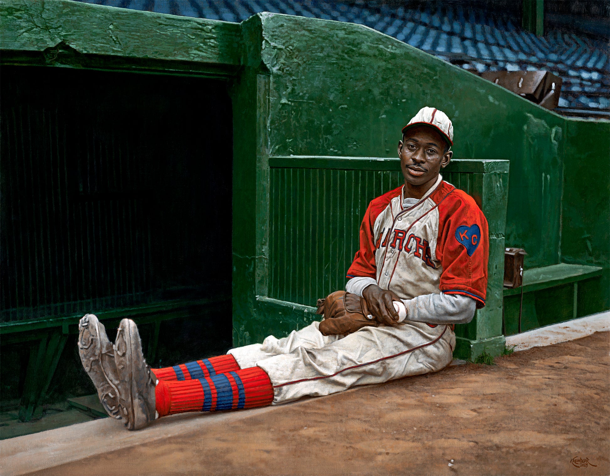 The original painting is based on a Detroit News photograph of Leroy “Satchel” Paige with the Kansas City Monarchs taken on September 8, 1941. The image depicts Paige sitting in the dirt against the Briggs Stadium dugout wall, part of a number of shots taken to drum up interest for a big doubleheader in Detroit against the Chicago American Giants on the 14th.